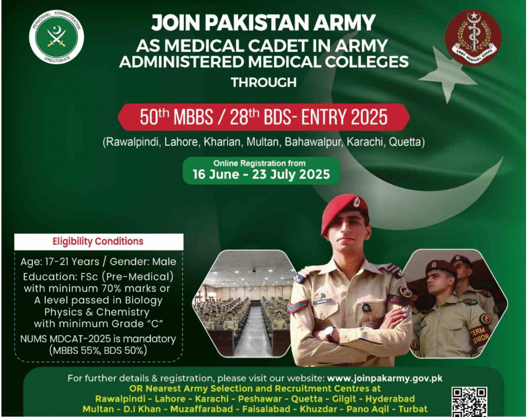 To join the Pakistan Army as a Medical Cadet, apply as a male citizen of Pakistan (or domicile holder of AJK/GB) with strong pre-medical academics. The selection process includes preliminary tests, physical/medical assessments, and interviews. Dual nationals must surrender other nationalities, and “Hope Certificates” are accepted for appearing F.Sc. Part-II candidates.