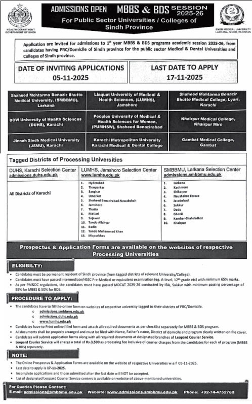 Admissions are now open for the 1st Year MBBS & BDS Session 2025-26 for candidates having PRC/Domicile of Sindh Province. Applications are invited for public sector medical and dental universities/colleges under the Health Department, Government of Sindh.