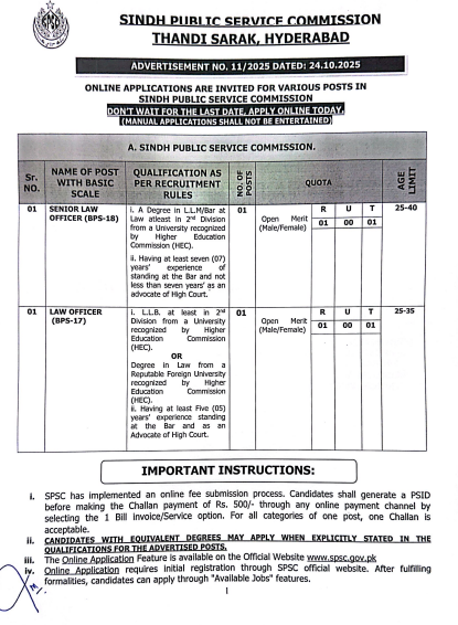 Sindh Public Service Commission (SPSC) Thandi Sarak, Hyderabad Advertisement No. 11/2025 Dated: 24-10-2025